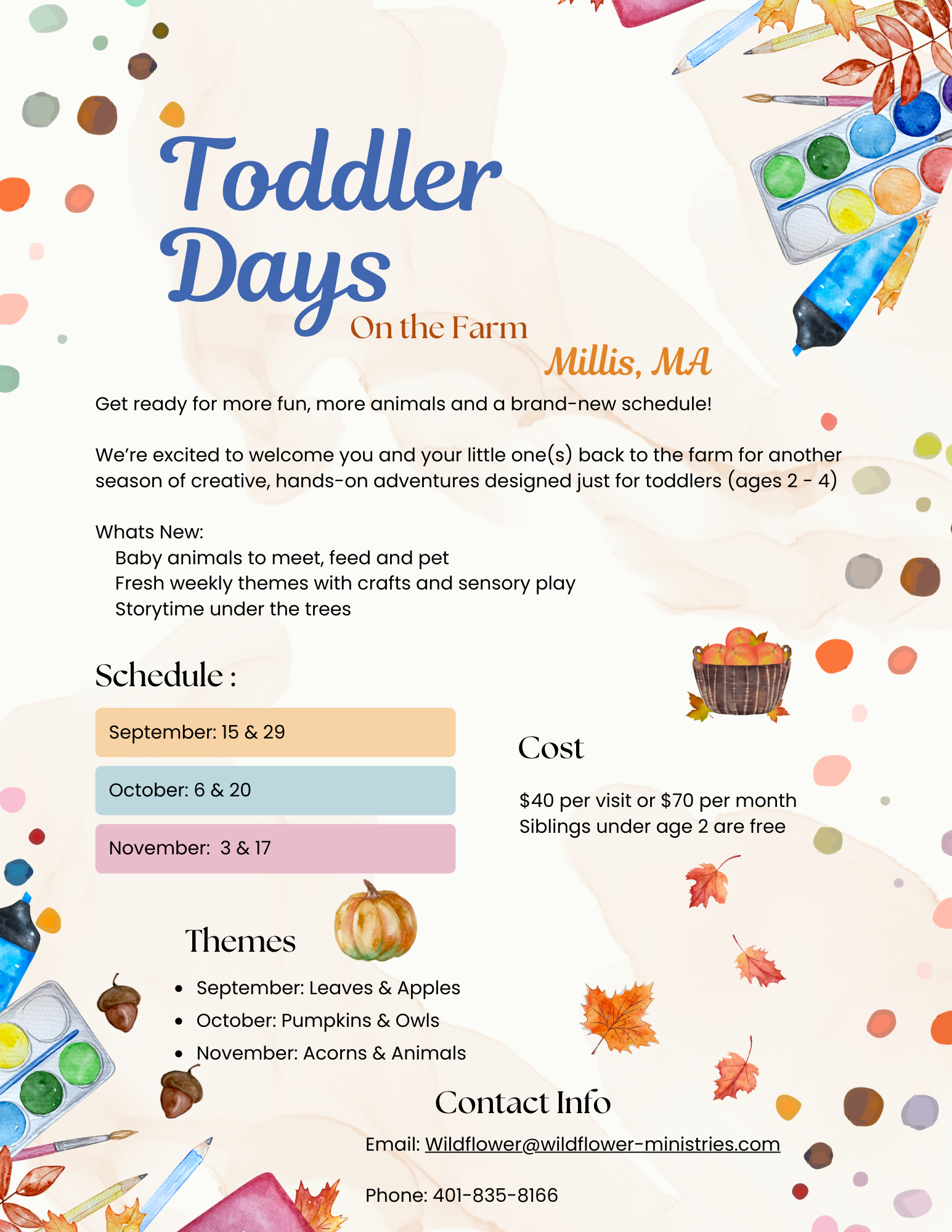 Parents and toddlers 2-4 can join us for daily chores (egg collecting, animal feeding, gardening and more) story time, forest walks and exploring the farm. Please submit an inquiry for to be added to our email list for updates for the 2025/26 season